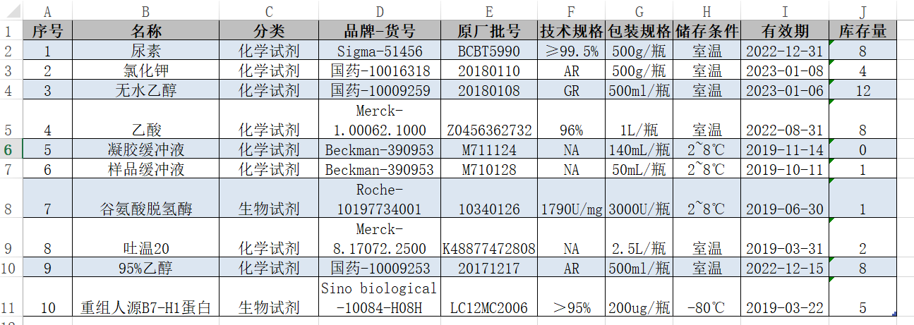 下(xià)圖是一份常見的(de)實驗室試劑庫存表格,名稱、分(fēn)類、批号、規格、儲存條件、有效期、庫存量等都排得(de)清清楚楚,便于登記。