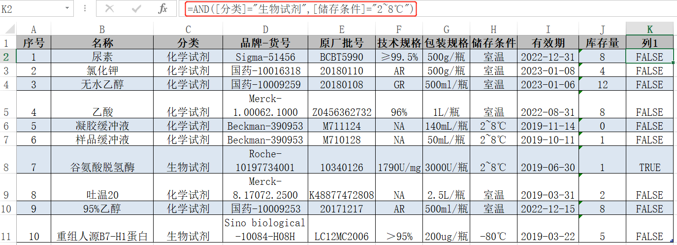 在K2單元格輸入公式=AND([分(fēn)類]=”生物(wù)試劑”,[儲存條件]=”2~8℃”),點擊回車,雙擊單元格填充公式,結果如下(xià),可(kě)以看到隻有第8行爲TRUE,小編尋找的(de)需要冷(lěng)藏儲存(2~8℃)的(de)生物(wù)試劑正是谷氨酸脫氫酶。