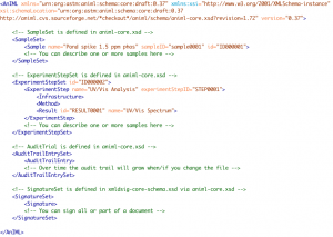 如果我們有心好好看看AnIML的(de)技術文檔,你會發現AnIML就是純粹的(de)XML技術。這(zhè)将大(dà)大(dà)降低我們利用(yòng)這(zhè)一新技術的(de)難度。能夠讀取和(hé)解析XML文檔的(de)軟件不勝枚舉。爲了(le)掃盲,我這(zhè)裏再啰嗦幾句。XML是完全基于普通(tōng)文本的(de)。即便存儲二進制表示的(de)圖片,也(yě)會先将二進制轉換爲字符串再放入XML文檔中。我們可(kě)以用(yòng)最簡單的(de)閱讀工具——記事本查看XML文檔。想想就知道這(zhè)是多(duō)麽美(měi)好的(de)一件事情,數據長(cháng)期存儲的(de)擔心可(kě)以落地了(le),找不到原始工作站軟件的(de)人(rén)也(yě)可(kě)以出口氣了(le)。當然,那些認爲可(kě)以更方便修改數據的(de)人(rén)美(měi)夢做(zuò)得(de)就有點早了(le)。