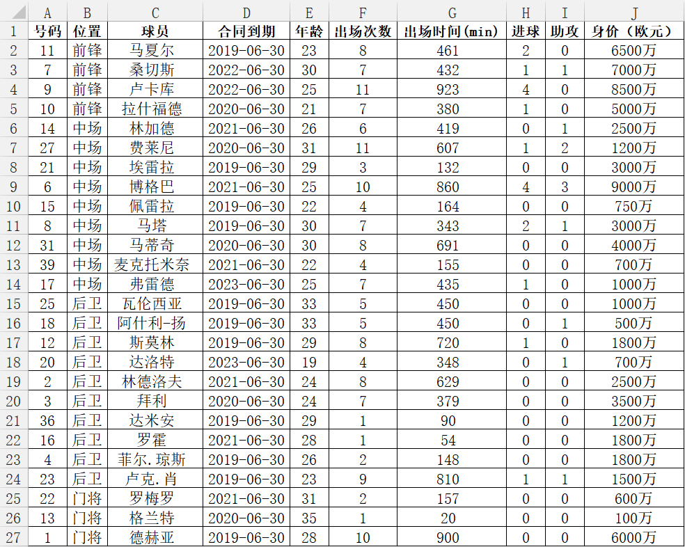 下(xià)表爲曼聯足球俱樂(yuè)部一線隊球員(yuán)信息統計(截止到2018-10-17):