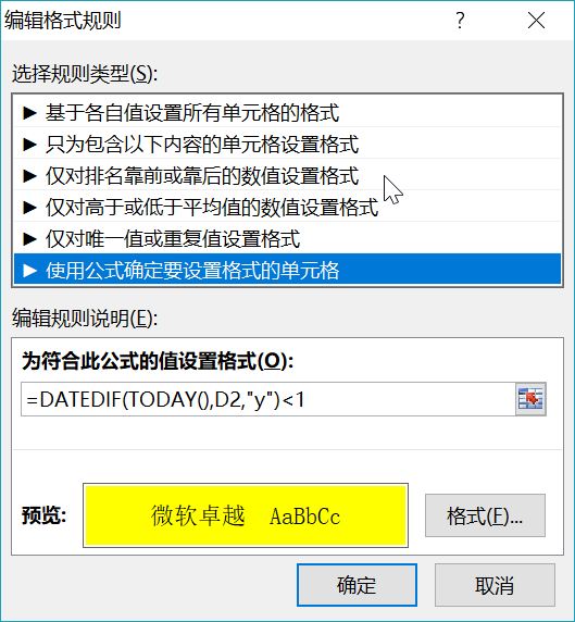 2.在編輯規則說明(míng)中我們輸入設置條件爲=DATEDIF(TODAY(),D2,”y”)<1,單元格格式設置爲黃(huáng)色。