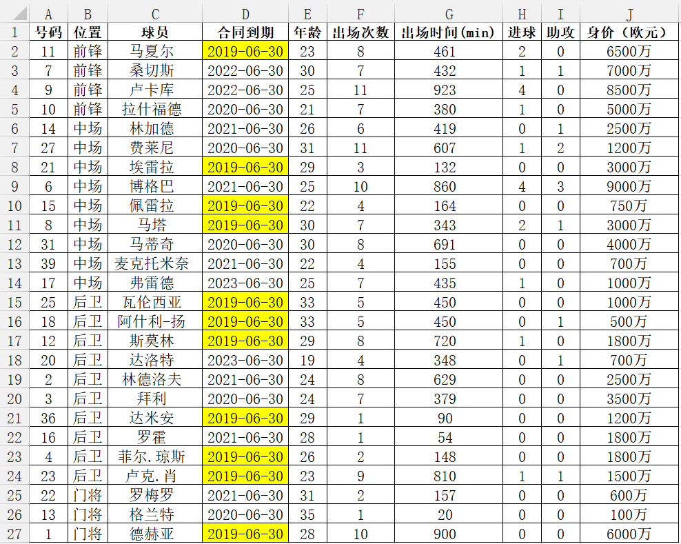 前段時(shí)間看到一則曼聯足球俱樂(yuè)部的(de)新聞:據《天空體育》報道,由于和(hé)俱樂(yuè)部的(de)合同将在明(míng)夏到期,包括德赫亞、馬夏爾以及隊長(cháng)瓦倫西亞在内的(de)11名曼聯球員(yuán)都将面對(duì)不确定的(de)未來(lái)。對(duì)于曼聯主教練和(hé)曼聯球迷而言,都是個(gè)壞消息,本期借這(zhè)個(gè)主題爲大(dà)家介紹如何在Excel中利用(yòng)條件格式設置合同到期自動提醒。