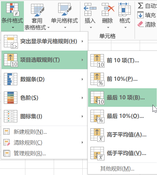 2.選中E2:E27數據區(qū),單擊【開始】【條件格式】【項目選取規則】【前十項】,對(duì)話(huà)框後爲值最大(dà)的(de)那些單元格設置格式:10,設置爲淺紅色。