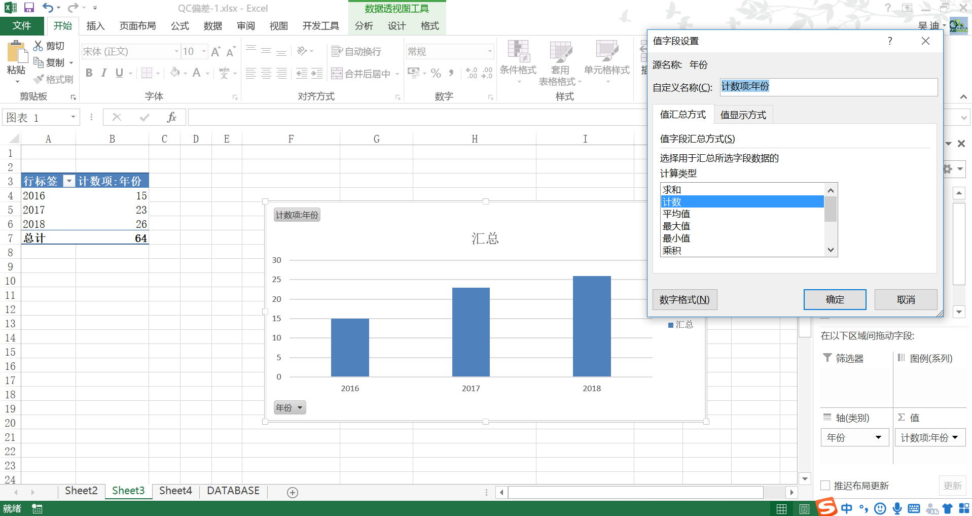 例如,你想按年份進行偏差分(fēn)類彙總,則隻需在右側數據透視圖字段選項中勾選年份,使用(yòng)鼠标拖動年份到圖例(軸)和(hé)值。更改值計數方式,單擊“計算(suàn)項:年份”,右鍵選擇值字段設置,計算(suàn)類型選擇“計數”。
