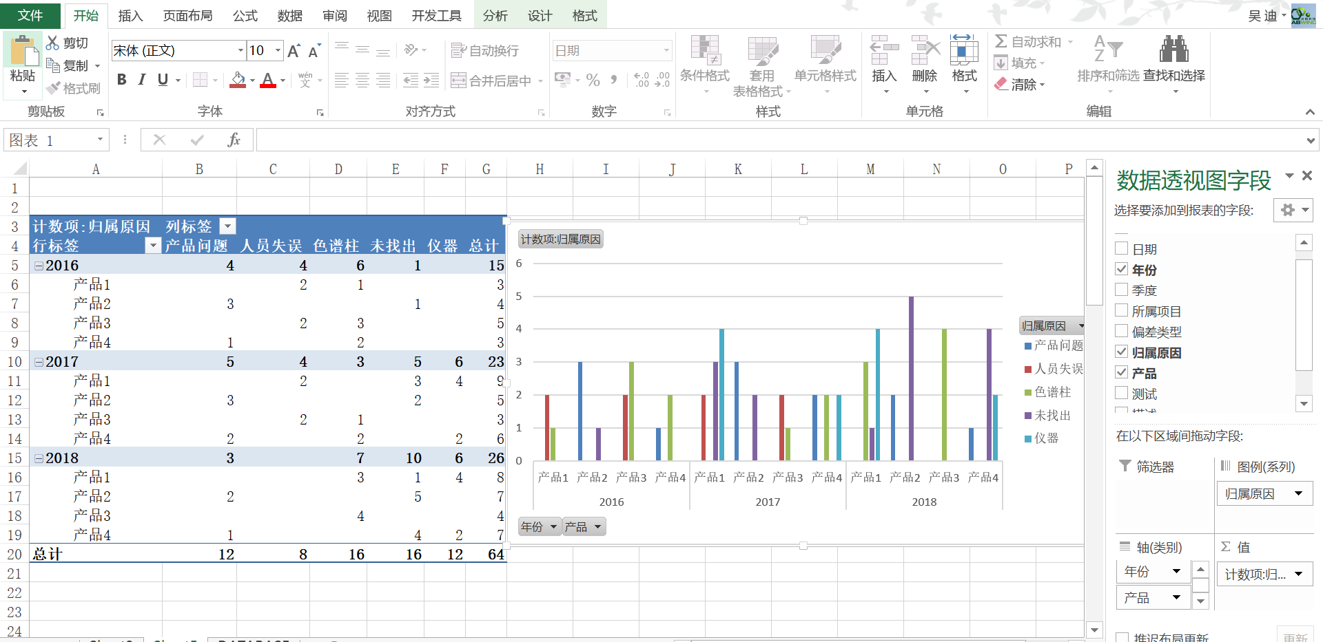 在數據透視圖字段中勾選“年份”、“歸屬原因”、“産品”字段。(實際操作根據個(gè)人(rén)需要勾選字段即可(kě))。